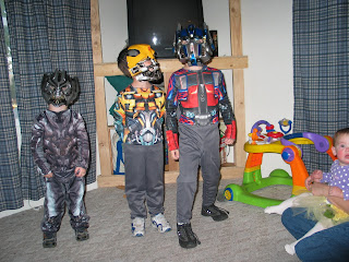 Our little transformers - Megatron, Bumblebee (Mom, I'm wearing my bumblebee shirt under my costume), and Optimus Prime!